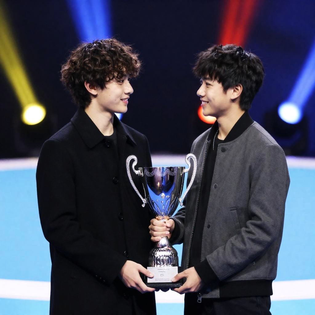 Two boys with curly dark hair, one in a black coat, the other in a gray jacket, smiling at each other while holding a silver trophy in a light blue circular pool. Background has blurred colorful lights.