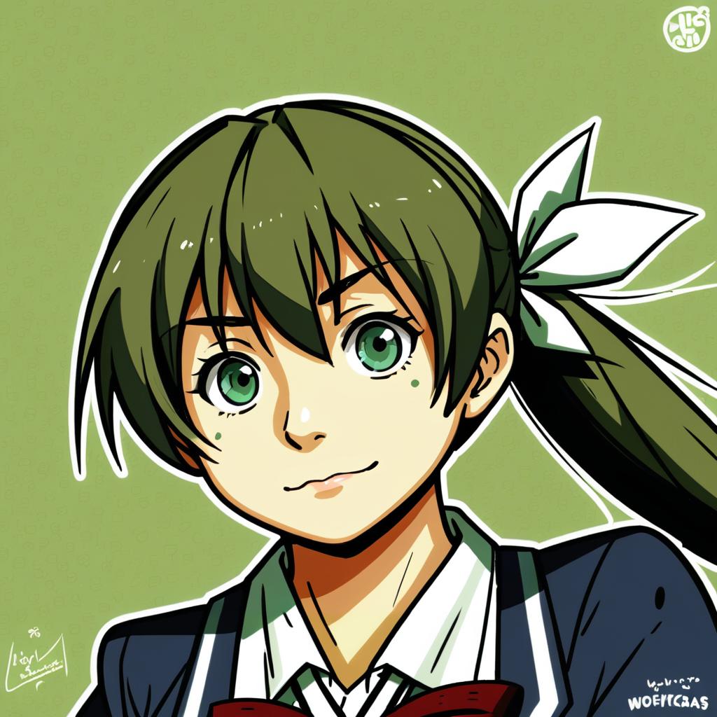 Digital anime-style illustration of a young girl with green eyes and brown hair tied in a long ponytail with a white hair ribbon. She has a small mole under her eye and is wearing a classic Japanese school uniform with a navy blue jacket and a white shirt. The background is a solid muted green, emphasizing the character's features.