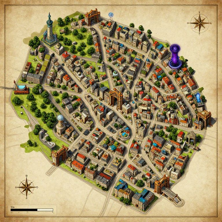 D&d city map generator concept, fantasy cityscape with winding alleys, ornate city gates, mystical landmarks like arcane towers, lush parks, detailed rooftops, vintage map style with compass rose and scale bar, warm sepia tones blending with vibrant map details, immersive and functional for adventure gaming