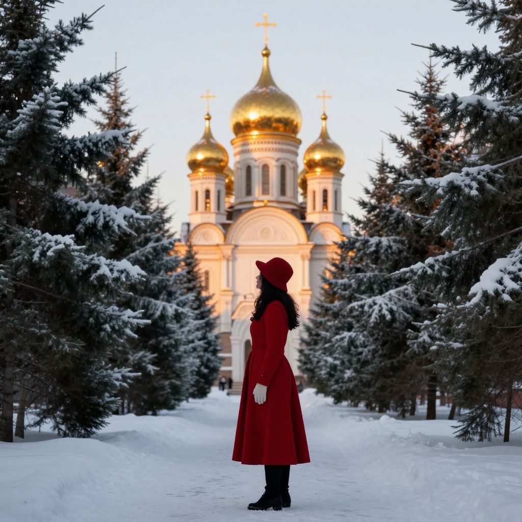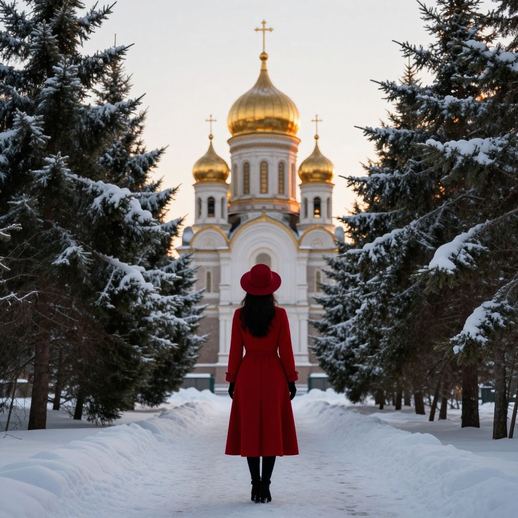 Photograph of a solitary woman with long black hair, wearing a red coat, red hat, and black boots, standing on a snow-covered path flanked by snow-laden evergreen trees. She faces an Orthodox church with three golden domes, glowing in the setting sun. The church's white walls and golden crosses contrast with the dark green of the trees and the bright white snow. The path leads directly to the church, creating a central focus on the building and the woman's silhouette. The scene exudes a sense of peaceful solitude and spiritual contemplation.