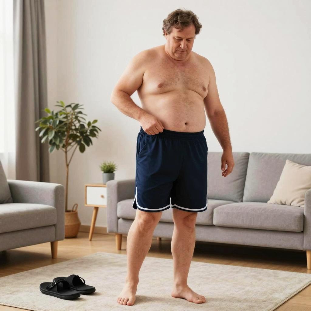 Realistic photo.Wide shot of a whole-body figure of a 45-year-old Caucasian man, slightly overweight, getting dressed in sports clothes at home, realistic commercial photo realistic photo