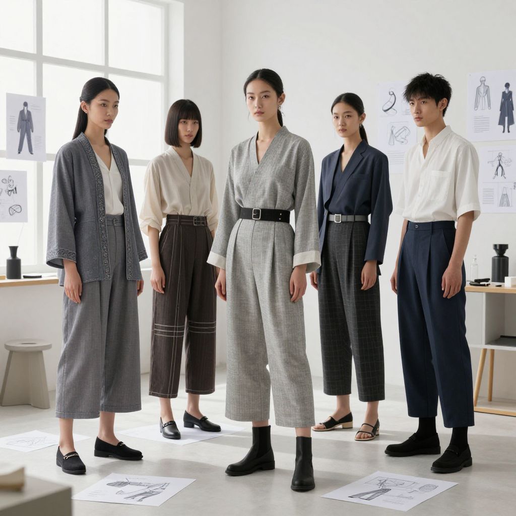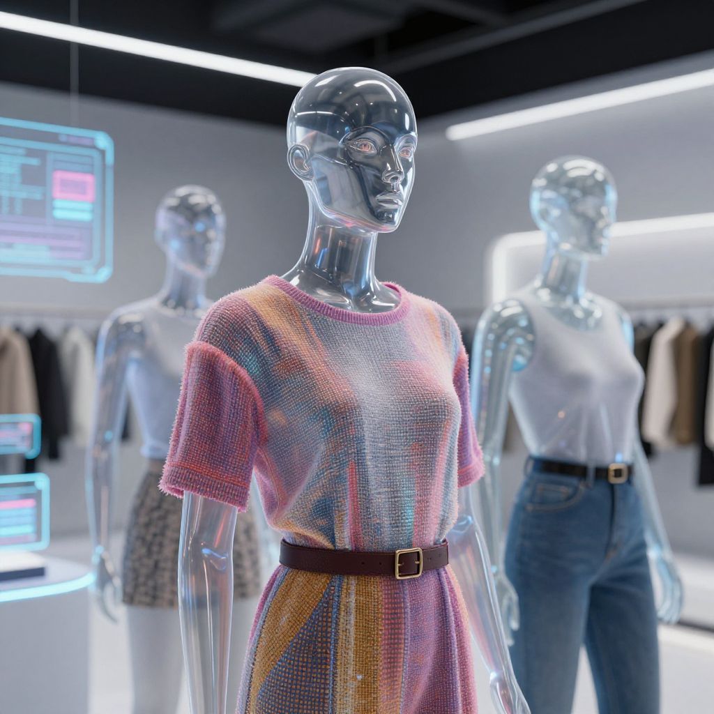A high-end fashion style clothing catalog showcasing a diverse range of outfits, from casual streetwear to formal wear, arranged neatly on sleek white mannequins in a spacious, well-lit warehouse.
