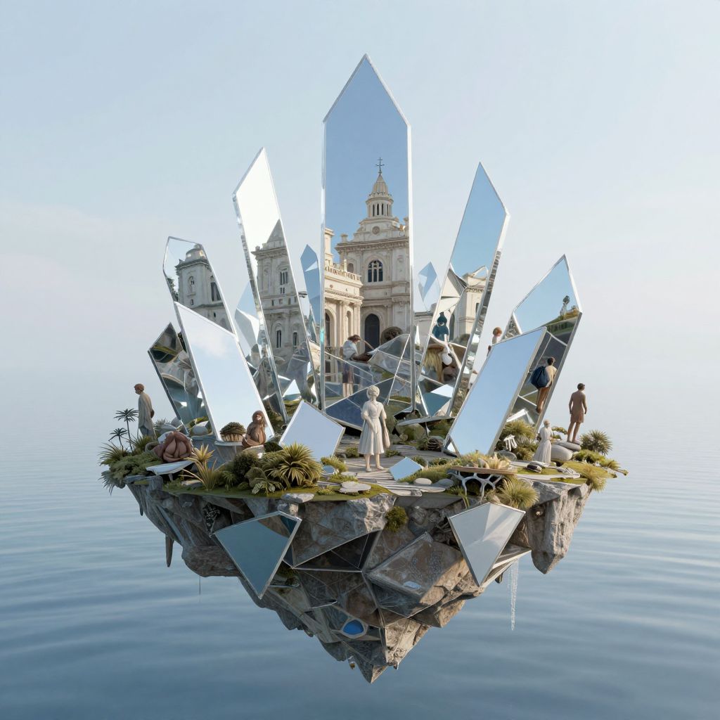 A surreal assembly of mirrored shards stands on a tranquil floating island, each reflecting alternate realities where history bends and human stories intertwine in impossible harmony.