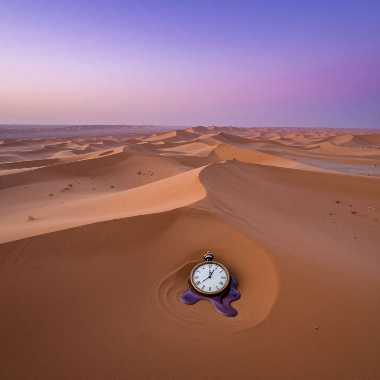 Photograph of a desert landscape with a clock partially buried in sand, shadows cast across dune patterns, under a gradient sky from purple to blue.