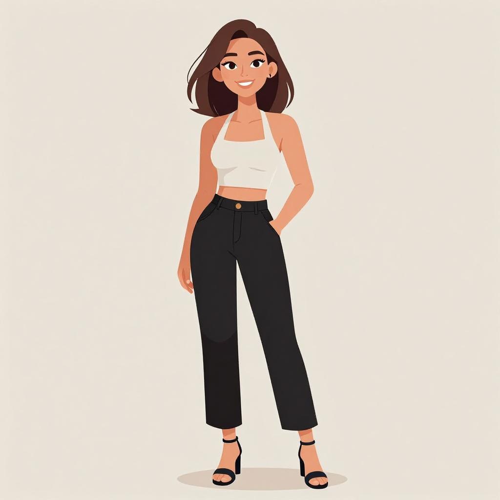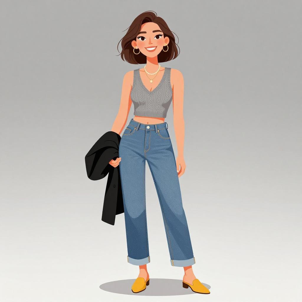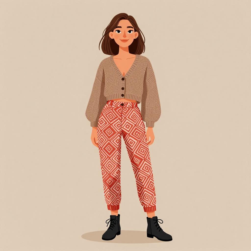 Woman with pretty face and pretty hair. smiling Woman, minimalist casual, oversized textured cardigan in a neutral beige hue, open front, drop shoulder, long sleeves, black top underneath, gray patterned high-waisted trousers, cropped length, black ankle boots with a slight heel, no visible accessories, plain white background. --sref 1467