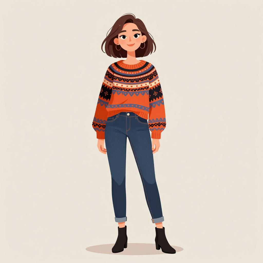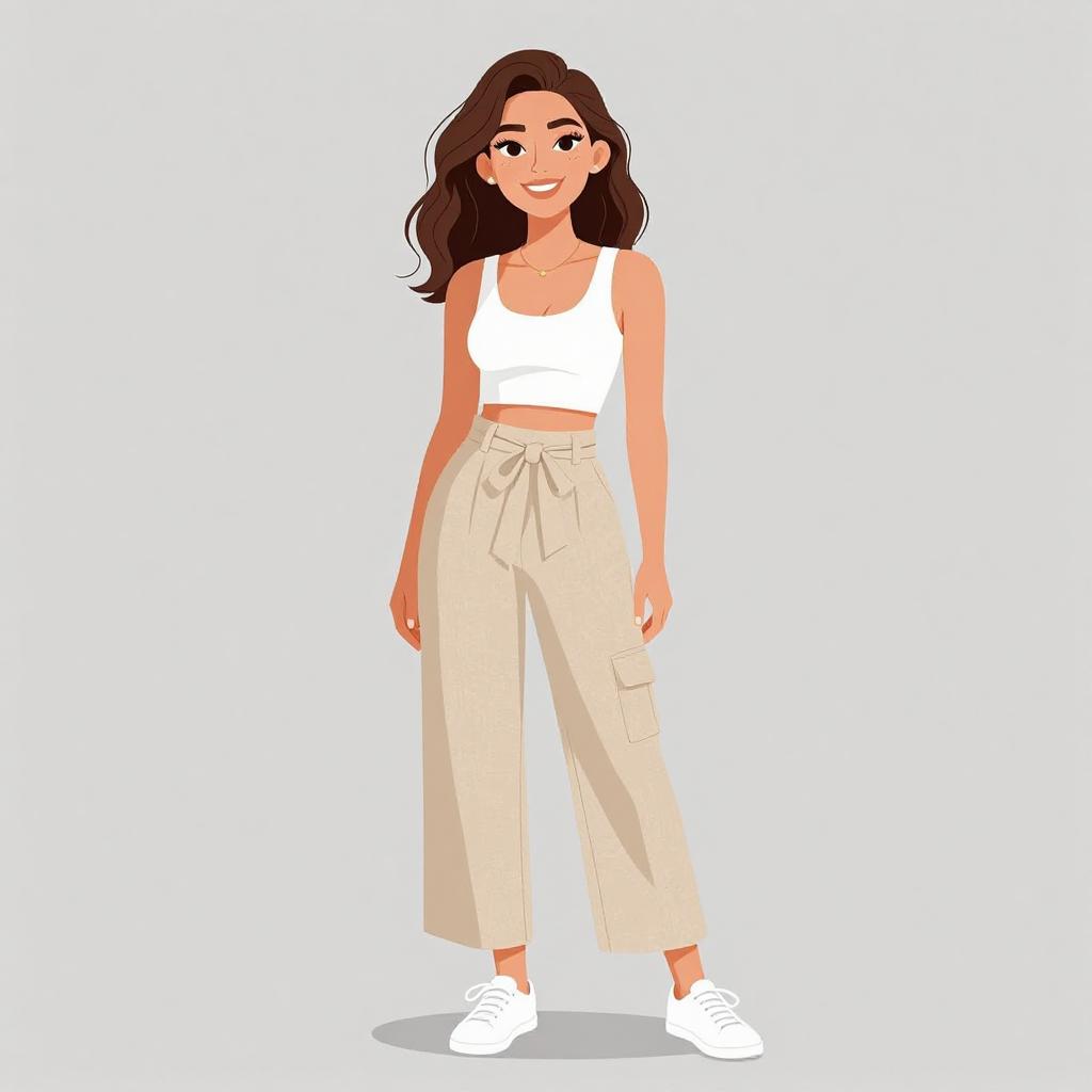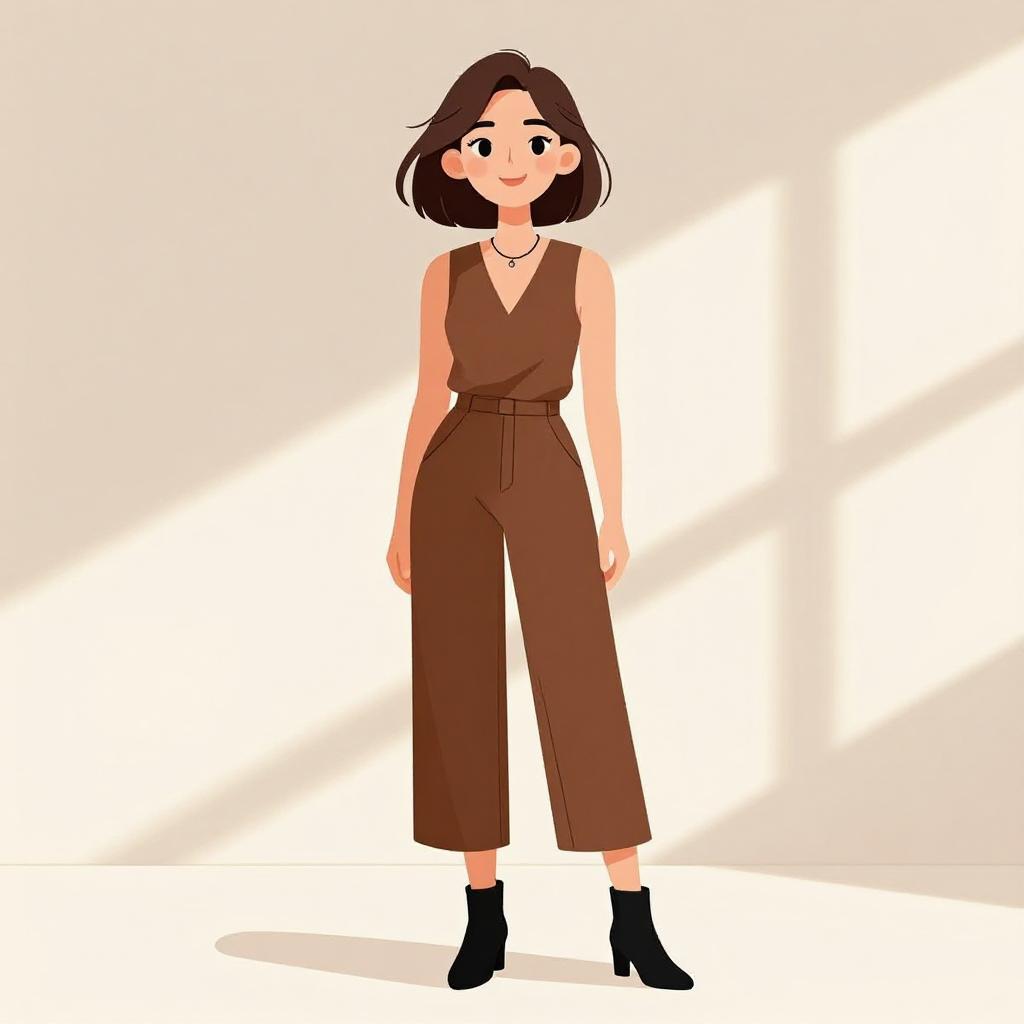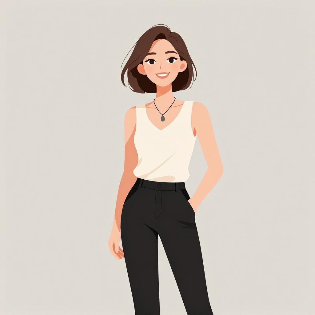 Woman with pretty face and pretty hair. smiling Woman, minimalist casual, oversized textured cardigan in a neutral beige hue, open front, drop shoulder, long sleeves, black top underneath, gray patterned high-waisted trousers, cropped length, black ankle boots with a slight heel, no visible accessories, plain white background. --sref 1467