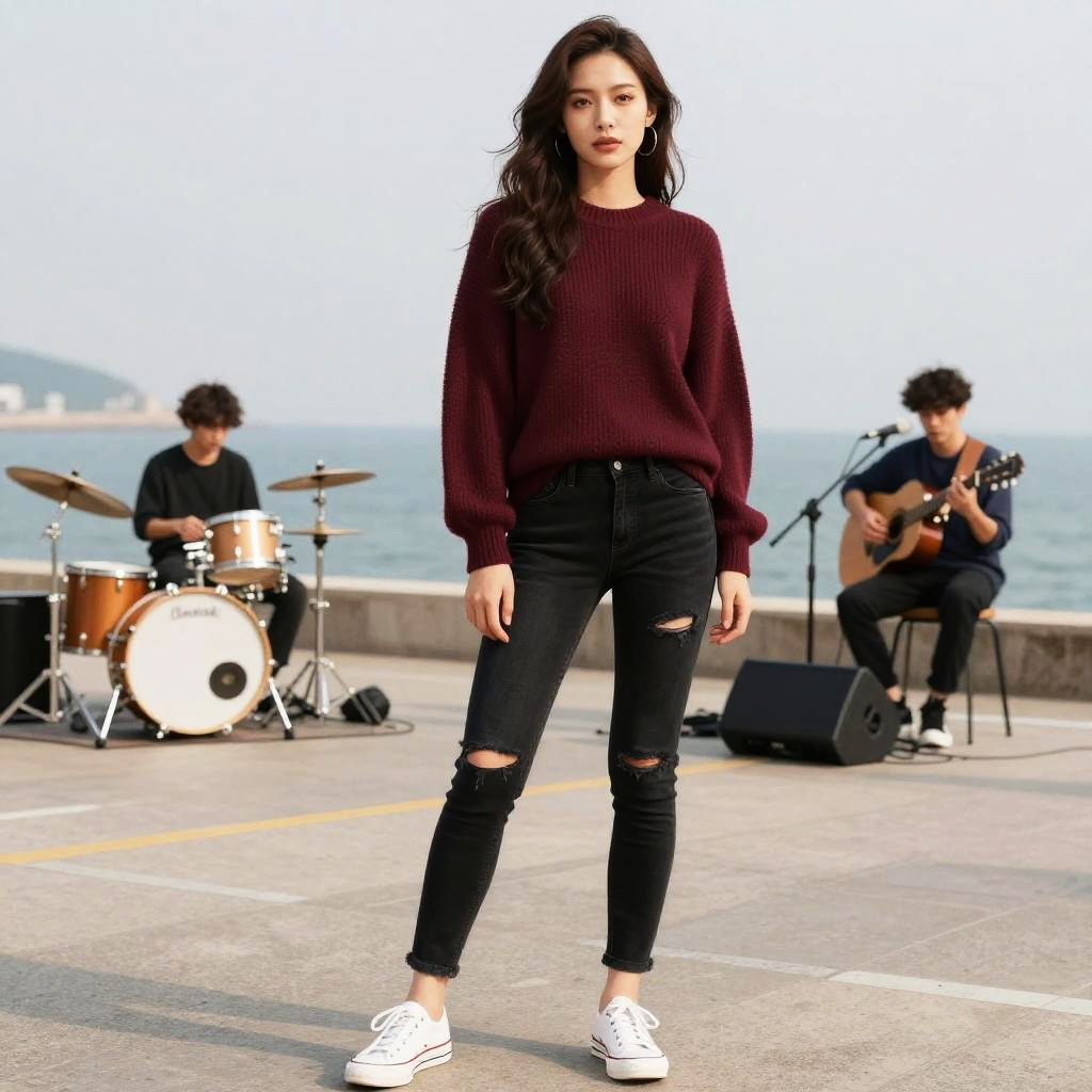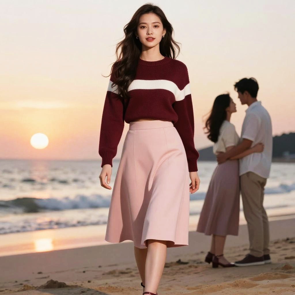A fashionable young Asian woman with long wavy hair walks on a sandy beach during sunset. She is wearing a modern preppy cropped burgundy and white sweater paired with a high-waisted pale pink skirt and burgundy ankle strap heels. In the background, a romantic couple embraces near the shoreline under the warm glow of the setting sun.
