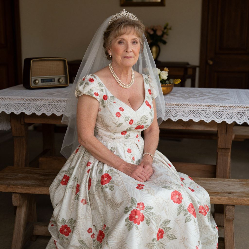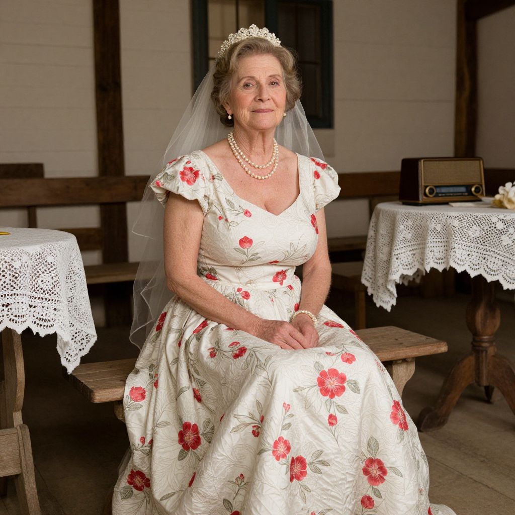 Photograph of an elderly white woman with short, gray hair, wearing a white wedding dress adorned with red floral patterns and a pearl necklace. She has a tiara on her head and a white veil draped over her shoulders. She sits on a wooden bench in a dimly lit room with a wooden table covered by a white lace tablecloth in the background. An old-fashioned radio is on the table. The woman's expression is calm and composed, with her hands resting on her lap. The room has a warm, rustic feel.