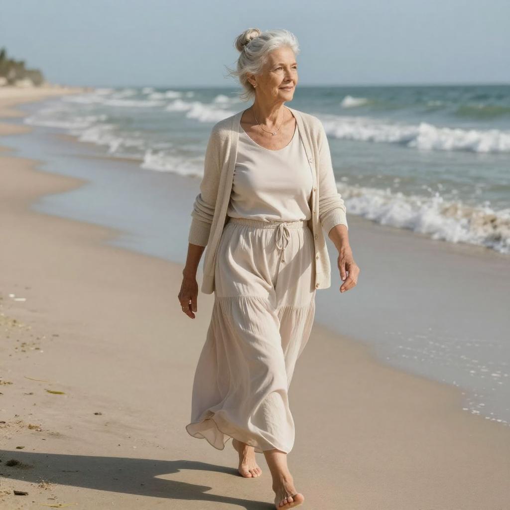 An elderly woman with silver hair tied in a bun walking down a sunny beach, wearing a light cardigan and flowy maxi skirt, captured in cinematic lighting with photorealism.