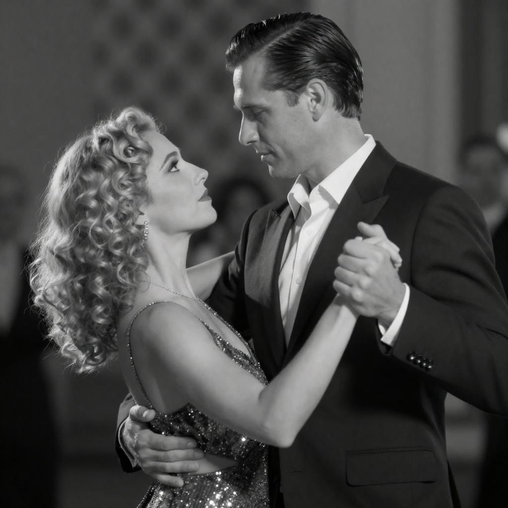 Black-and-white photograph of two dancers. Female dancer on left with blonde hair, feathered dress, arms outstretched. Male dancer on right in tuxedo, white shirt, flower boutonniere, arms raised. They hold hands, intense expressions, ornate architectural background.