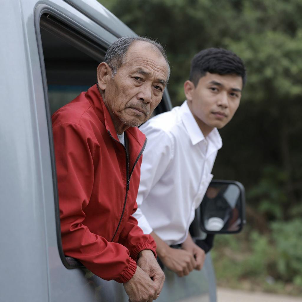 Photograph of two Asian men outdoors on a dirt path surrounded by greenery. One man is sitting cross-legged wearing a green jacket, white t-shirt, blue pants, and white socks. The other man is crouching, wearing a blue jacket, brown pants, black shoes, and a white headband. There is an old wooden box beside the sitting man and a bicycle next to the crouching man.