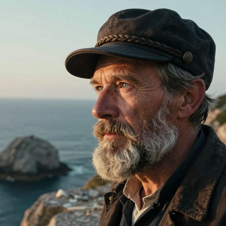 A captivating fine art portrait showcases an antique yet soulful sailor, his gentle blue eyes and rugged features weathered by the sea. His salt-and-pepper beard reflects warm sunlight, adding a touch of luminosity to his appearance. Framed by a classic fisherman's hat adorned with intricate braids, the sailor is positioned in an unconventional 'bug's-eye view' perspective, offering viewers a unique glimpse into his world. This unique viewpoint presents the depths of his weary yet determined gaze as he looks out to the sea from a rocky cliffside vantage point. The composition harmoniously blends serene coastal landscapes with subtle nautical elements, creating an emotionally charged atmosphere. It evokes a sense of nostalgia for simpler times, paying homage to the resilience of humanity and our innate connection with nature.