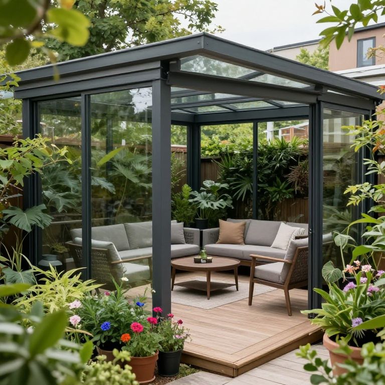 Photograph of a modern, glass-walled outdoor pergola with a black metal frame, surrounded by lush greenery. Inside, there's a gray cushioned sectional sofa with beige and brown pillows, and a wooden coffee table with a small plant. The pergola sits on a wooden deck, bordered by various potted plants with vibrant flowers. The background features tall trees and a wooden fence. The overall scene is bright and inviting, showcasing a blend of contemporary design and natural beauty.