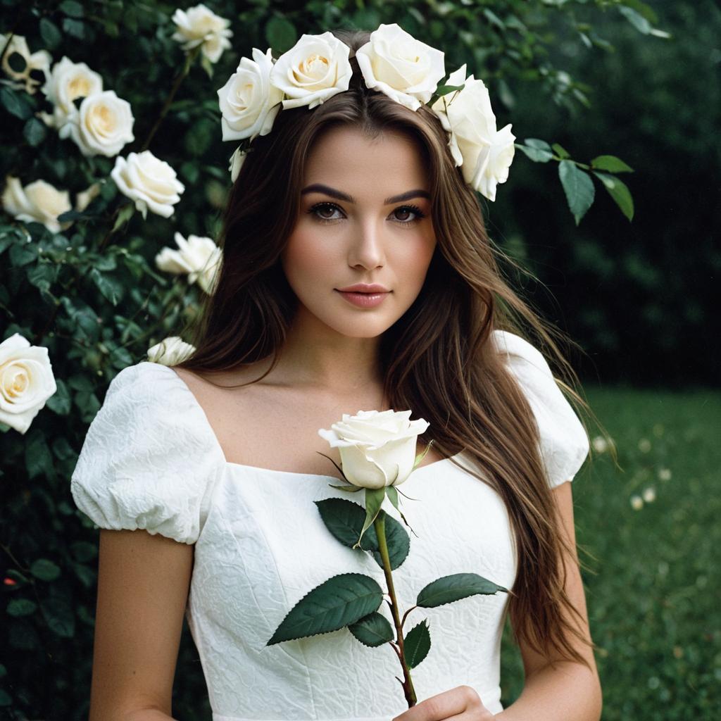 Portrait of a young woman with long brown hair and brown eyes wearing a white dress adorned with a red and pink rose floral print. She has a large white rose hair ornament on the side of her head. The setting includes vintage chairs and a table with a floral tablecloth and a tea set, suggesting a modern-day tea party atmosphere. The woman is looking directly at the viewer with a calm expression.