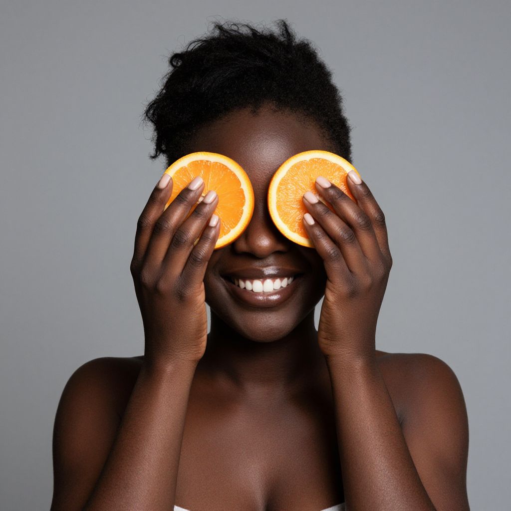 Photograph of a dark-skinned, topless woman with short, curly black hair, smiling widely. She holds two round, vibrant orange slices over her eyes, creating a playful, humorous effect. Her teeth are white and straight, and her nails are neatly manicured with a natural polish. The background is pure white, making her and the orange slices stand out prominently. The image has a high contrast, with her dark skin and the bright orange slices creating a striking visual contrast. The photograph has a clean, studio-like quality.