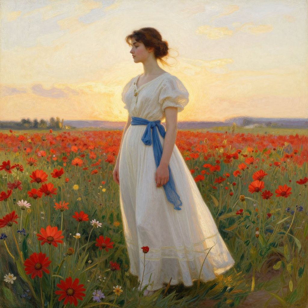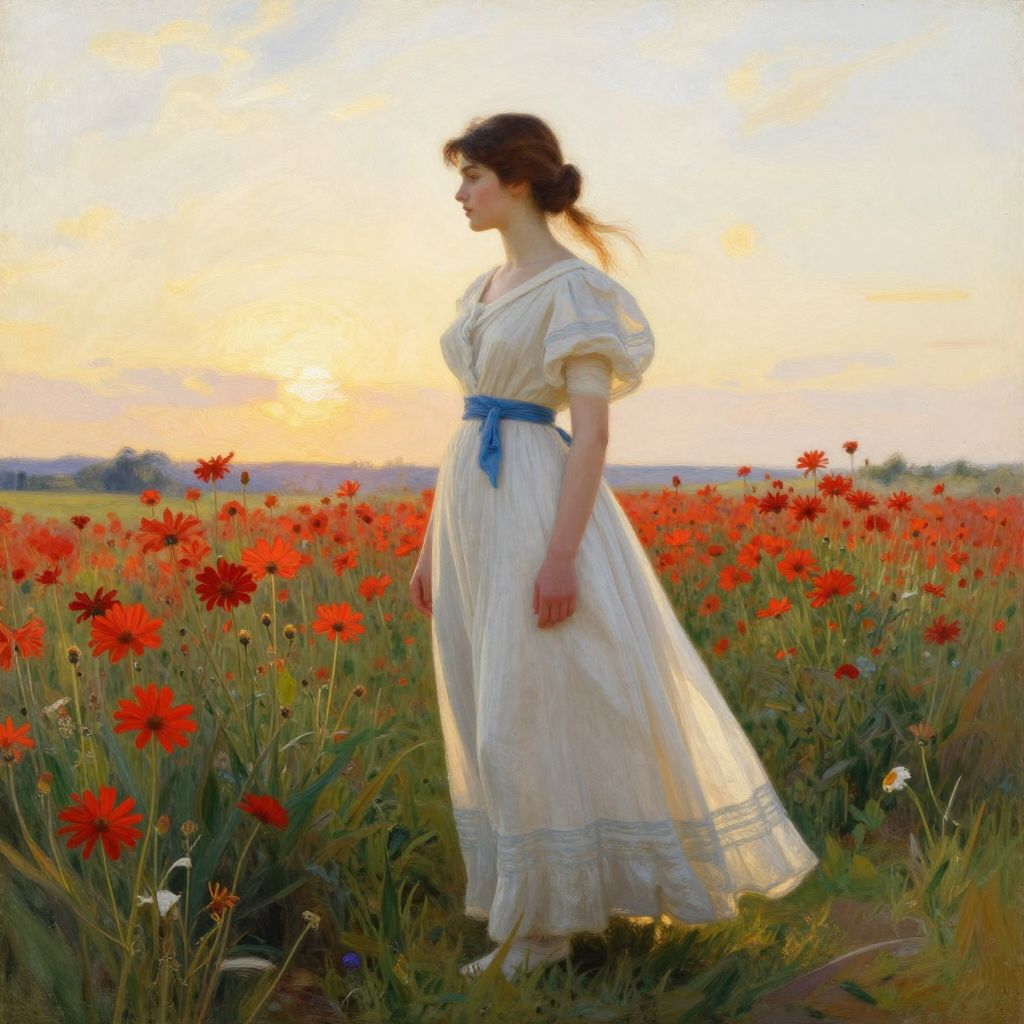 A serene digital artwork reminiscent of classical realism portrays a woman in a flowing white dress adorned with a blue sash, standing amidst a vibrant field of red daisies under a soft, golden-hour sky, capturing the timeless elegance and natural beauty characteristic of Winslow Homer's style.