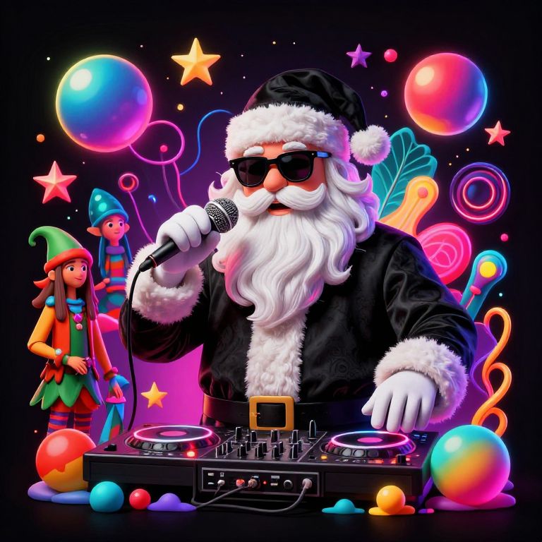 The image presents a vibrant, psychedelic Christmas scene set against a black background. At the center, a disc jockey Santa Claus, adorned with a long white beard and wearing a black jacket, holds a microphone in one hand and a DJ mixer in the other. His outfit is complemented by a black hat with a pom-pom and a pair of sunglasses. Surrounding Santa are various colorful, neon elements, including glowing spheres, stars, and abstract shapes that create a dynamic and energetic atmosphere. To the left, a group of hippie elves, characterized by their colorful clothing and accessories, add to the festive and eclectic vibe. The overall composition is rich in texture and color, with the neon lights and shapes interplaying to form a visually striking and imaginative scene.