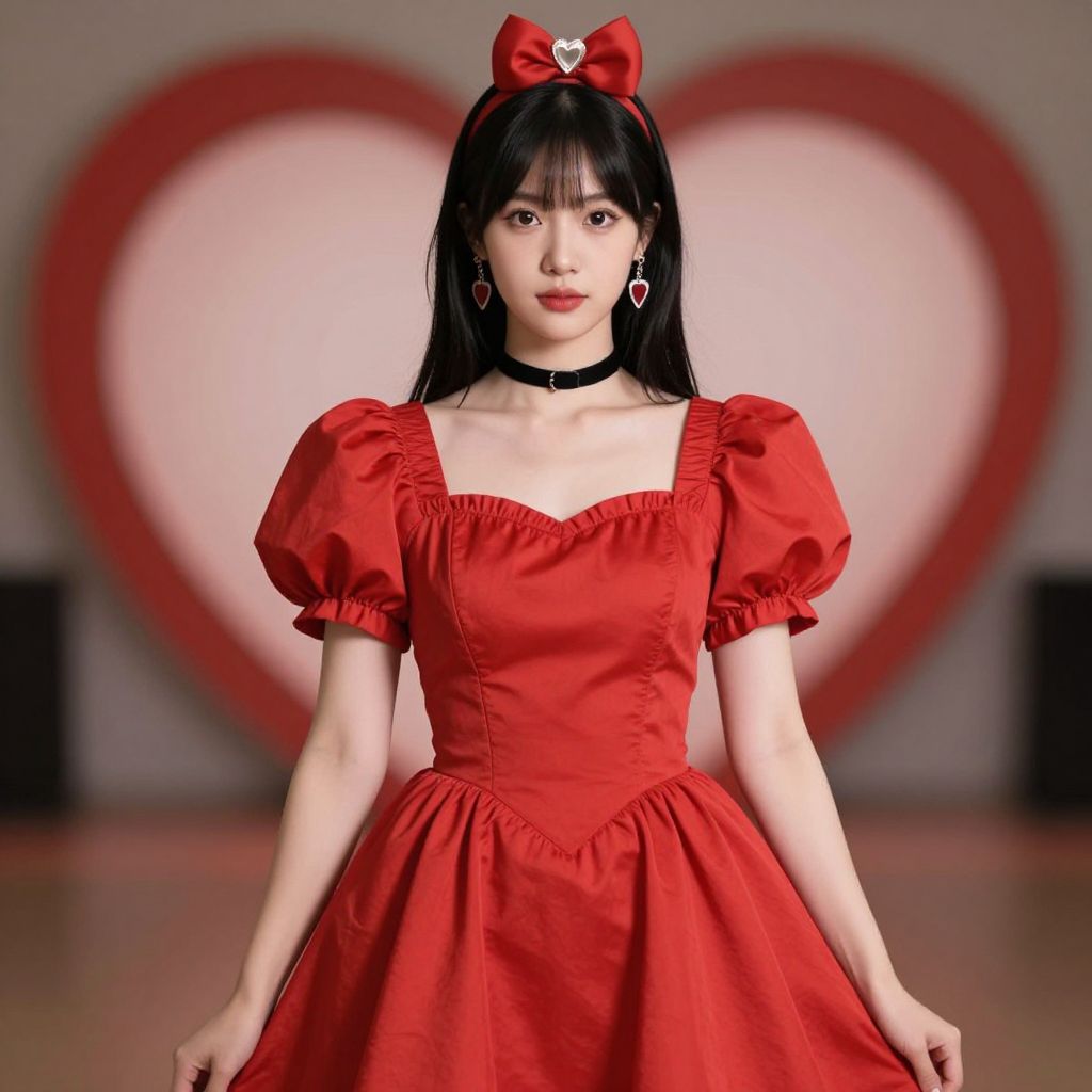 Queen hearts adult costume, 1girl, solo, dress, choker, puffy short sleeves, puffy sleeves, heart, blurry background, realistic, short sleeves, red dress, black hair, looking at viewer, blurry, earrings, hair ornament