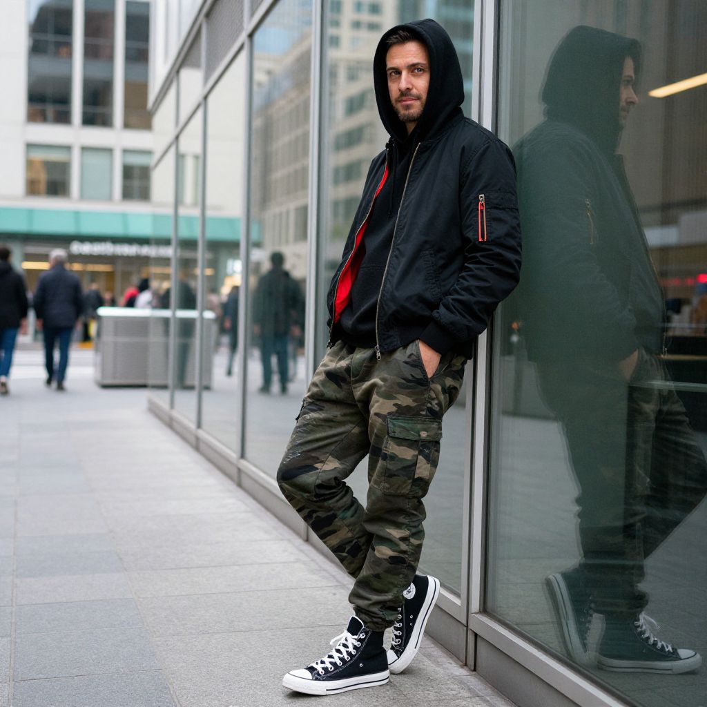 A man, fitted black hoodie, camo print joggers, high-top canvas sneakers, bomber jacket, bold color accents, modern glass facade, bustling city street, eastman llp film stock, leaning against a glass wall, confident smile.Man has masculine face and piercing eyes