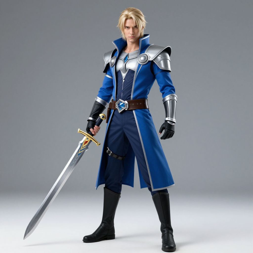 Vergil, male in a blue and silver costume holding a sword