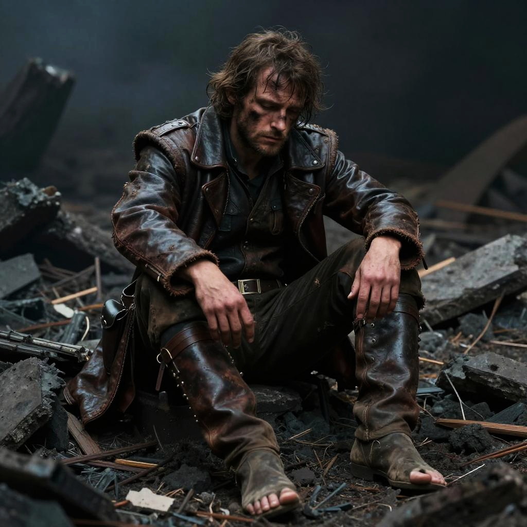 Photograph of a disheveled man with messy brown hair and a scruffy beard, sitting amidst rubble. He wears a worn, dark brown leather jacket with metal studs, black pants, and brown leather sandals. His expression is weary, with a downward gaze. The background is a dark, smoky environment with scattered debris, including broken wooden planks and charred remains. The lighting is dim, creating a somber, post-apocalyptic atmosphere. The man's leather jacket is slightly shiny, indicating wear and tear, while his pants are simple and rugged. The overall scene conveys a sense of hardship and survival.