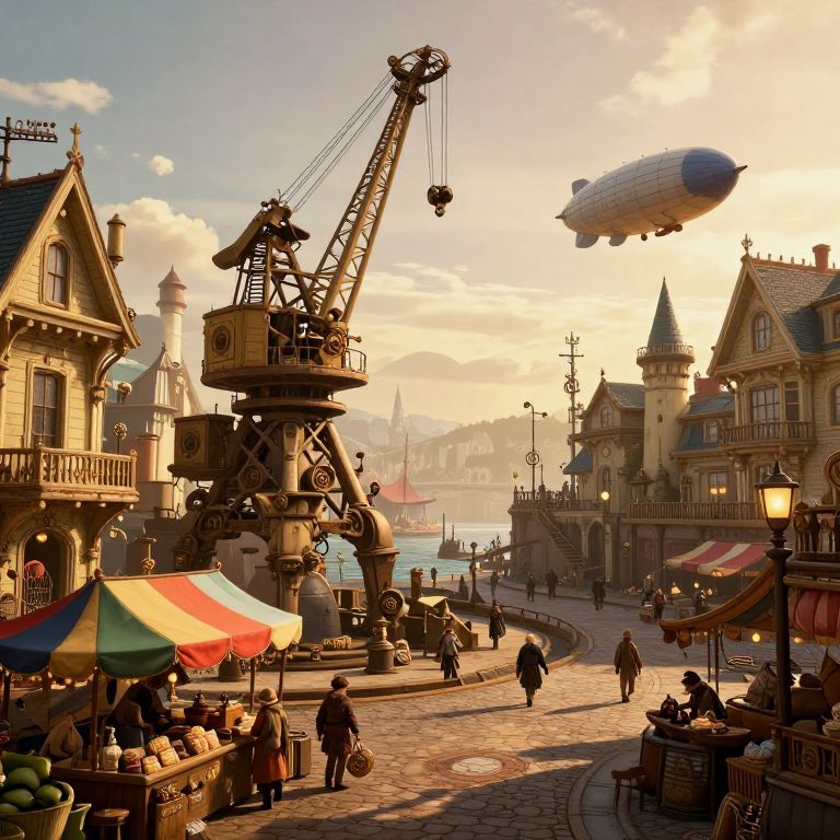 Lively Steampunk Harbor at Golden Hour