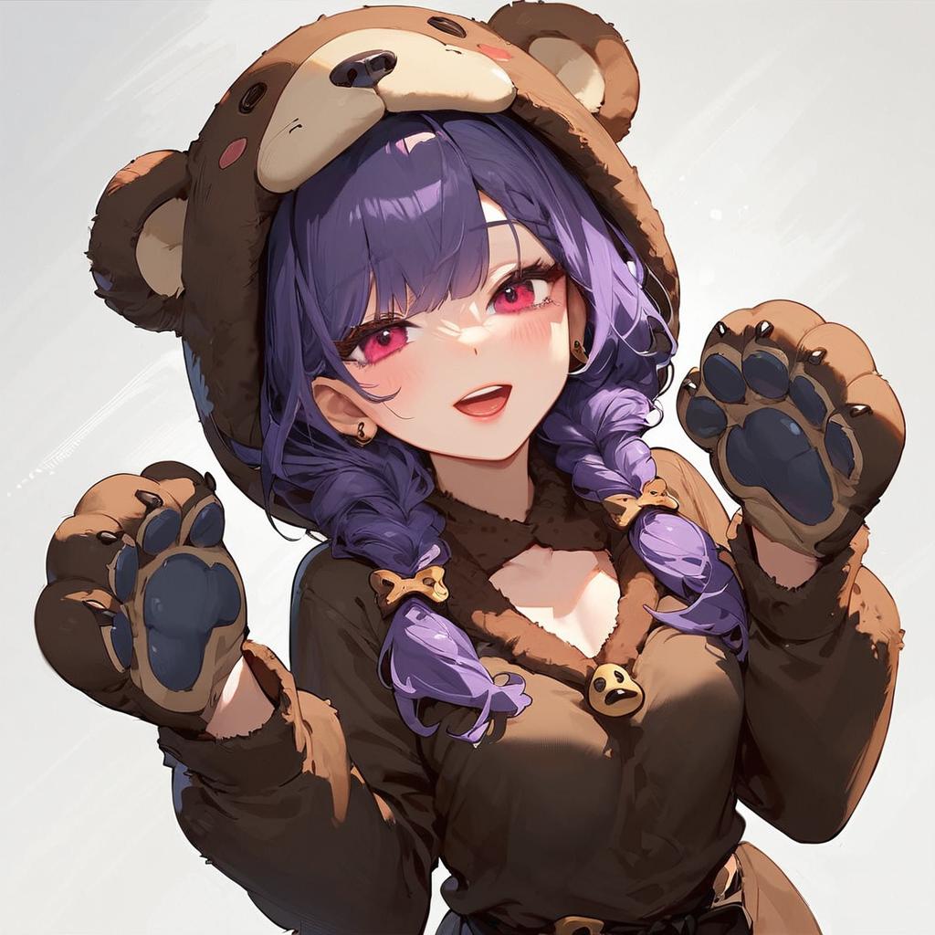 Score_9, score_8_up, score_7_up, best quality, masterpiece, uncensored, source_anime1girl, :d, animal costume, animal hands, animal hat, bear costume, bear hat, blush, female focus, small breasts, gloves, hands up, hat, mature female, looking at viewer, open mouth, orange eyes, paw gloves, purple hair, smile, solo, standing