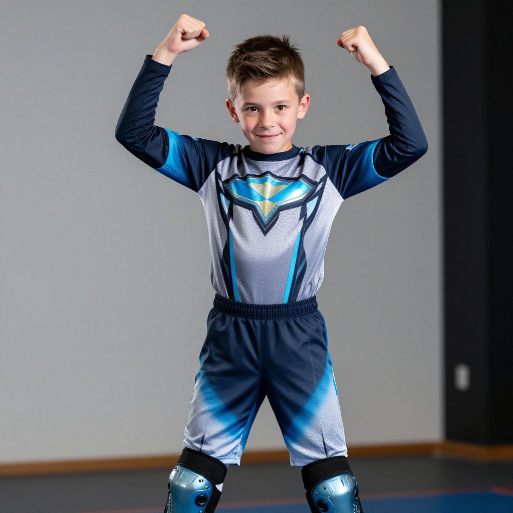 A teenage boy in a custom-designed athletic sportswear outfit that doubles as a superhero costume, mid-action pose with arms lifted, glowing blue accents, wearing a breathable performance mesh top and high-tech knee pads, his face is energetic and bold with a slight smirk and bright eyes reflecting the training lights