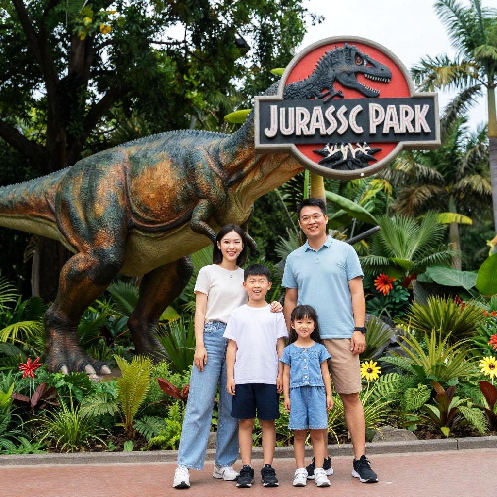 Photograph of a smiling Asian family of four standing in front of a Jurassic Park sign. The background features a large, lifelike, green and brown dinosaur statue amidst lush, tropical plants with various colors of leaves and flowers. The father, wearing a light blue polo shirt and beige shorts, stands to the right. The mother, in a white t-shirt and jeans, is to the left. Their son, in a white t-shirt and dark blue shorts, stands in the middle, while their daughter, in a blue patterned dress and black shoes, stands in front of him. The family is on a brick path.