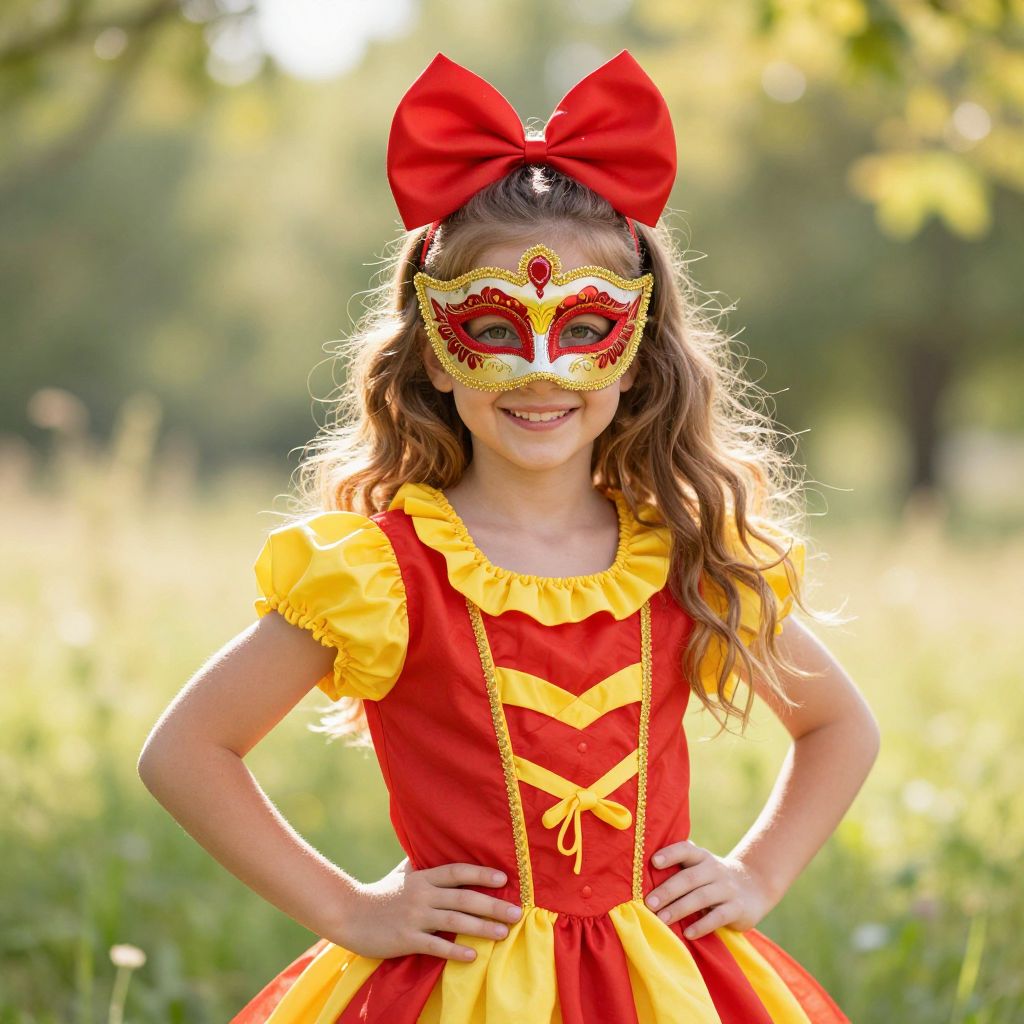 A beautiful young girl with long, flowing brown hair that falls past her shoulders, wearing a detailed green mask with intricate patterns and a fitted green dress that has soft green accents along the sleeves, hem, and neckline. The dress has a slightly flowing silhouette, giving a whimsical and enchanting look. She stands in a sun-dappled forest clearing, with golden light filtering through the trees, adding warmth and depth to the scene. Her expression is calm and curious, as if she's about to embark on a quiet adventure.