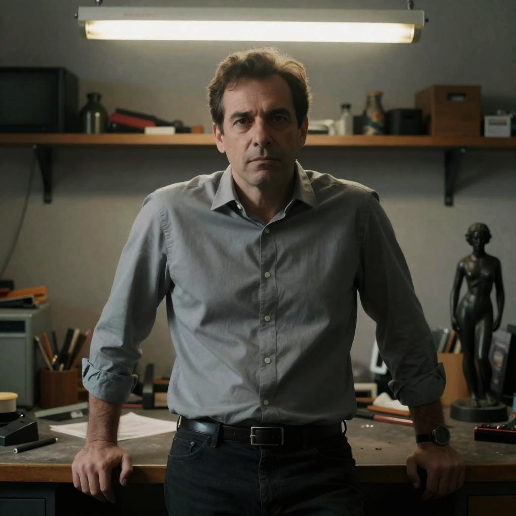 Middle-aged man with brown hair, mustache, wearing dark gray ribbed sweater over gray collared shirt, speaking in dimly lit room. Lamp with white shade on left, floral-patterned wall with pink lights in background. Man looks slightly surprised.