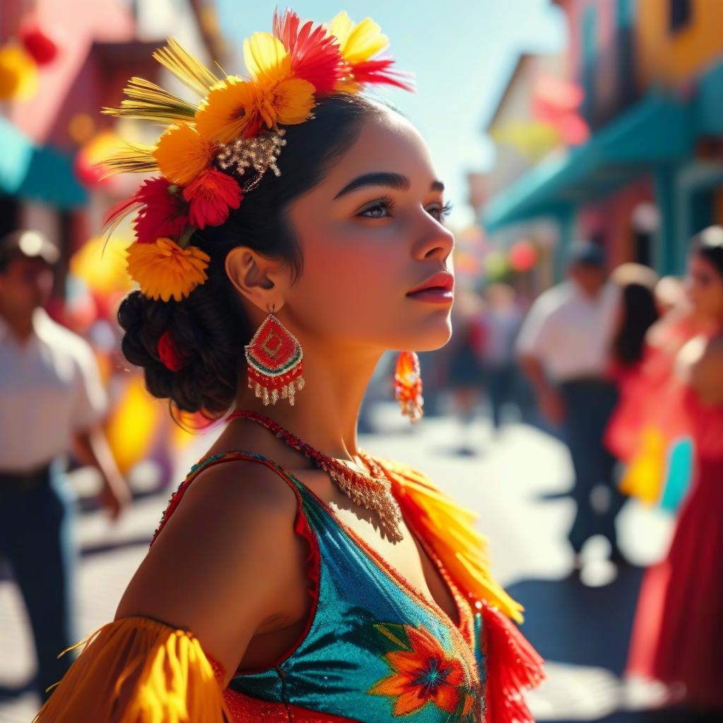 Cinematic portrait of Hispanic female dancer in festive street setting bathed in bright midday sun, Fujifilm emulation, vibrant colors, 4K ultra-realistic detail.