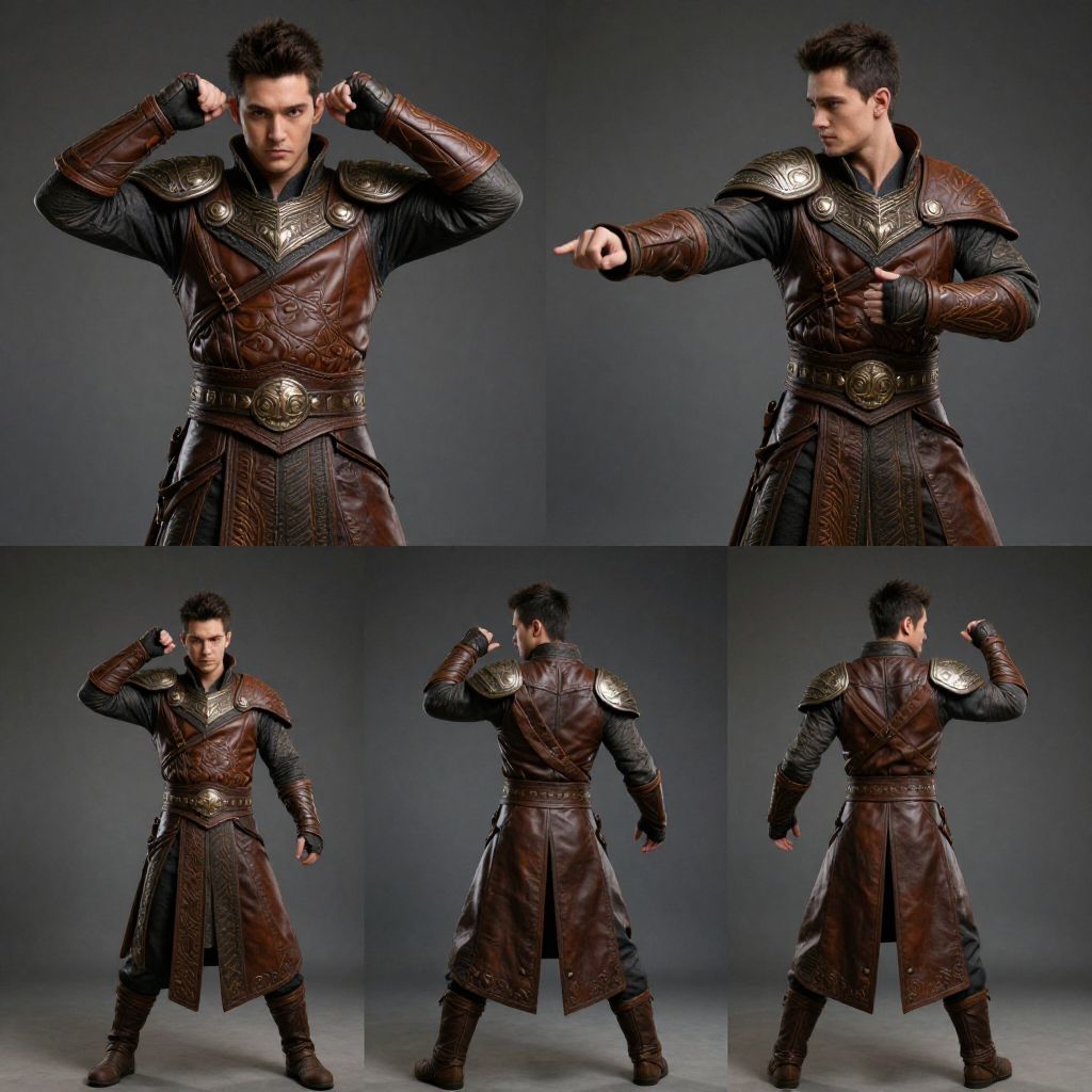 Male character turnaround with dynamic poses, showcasing different angles from front to back, in a fantasy warrior costume with leather and metal armor, intricate textures, dramatic lighting, atmospheric background with subtle fog