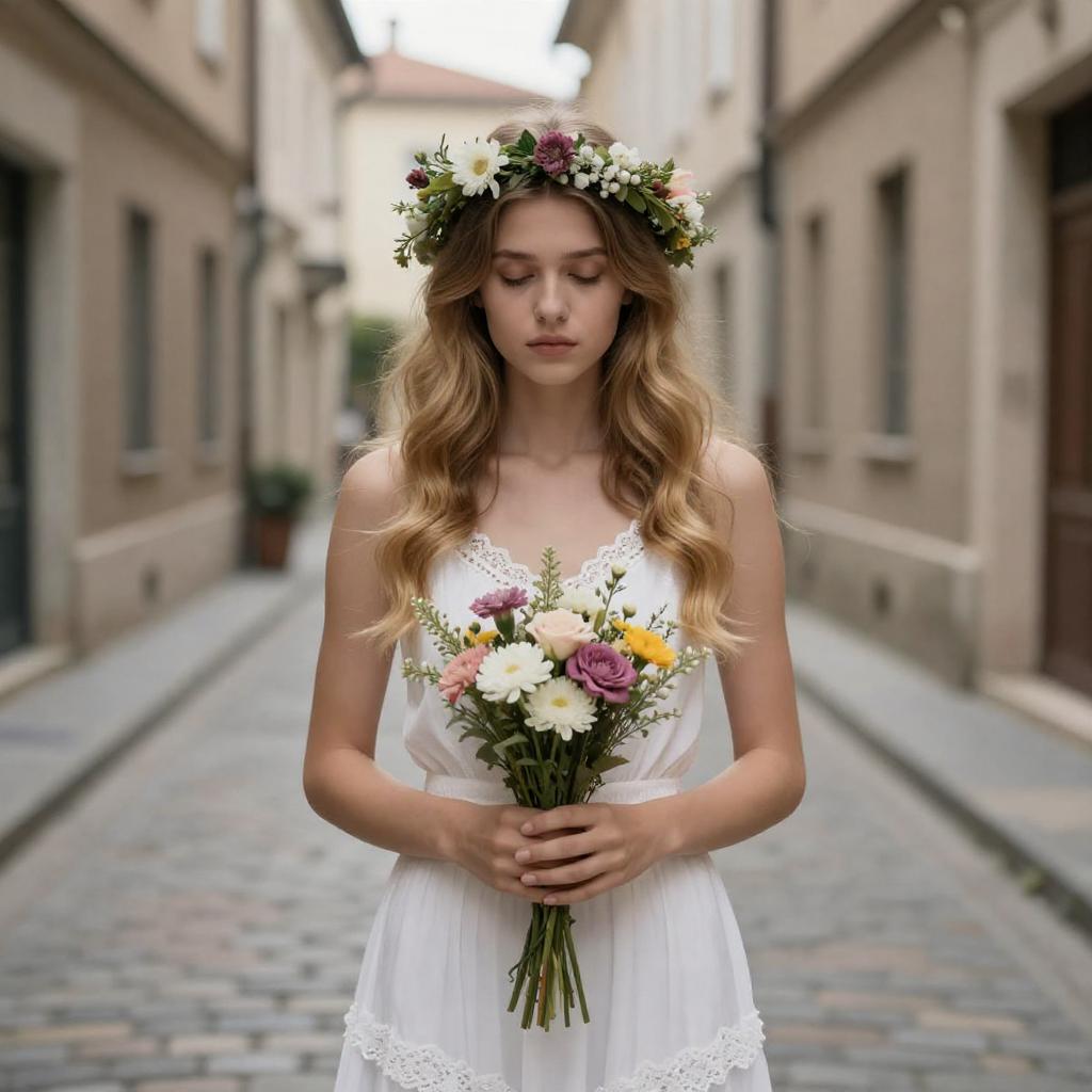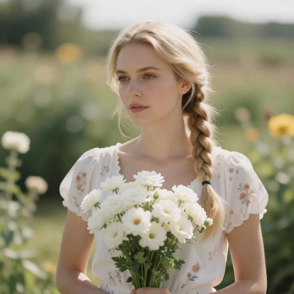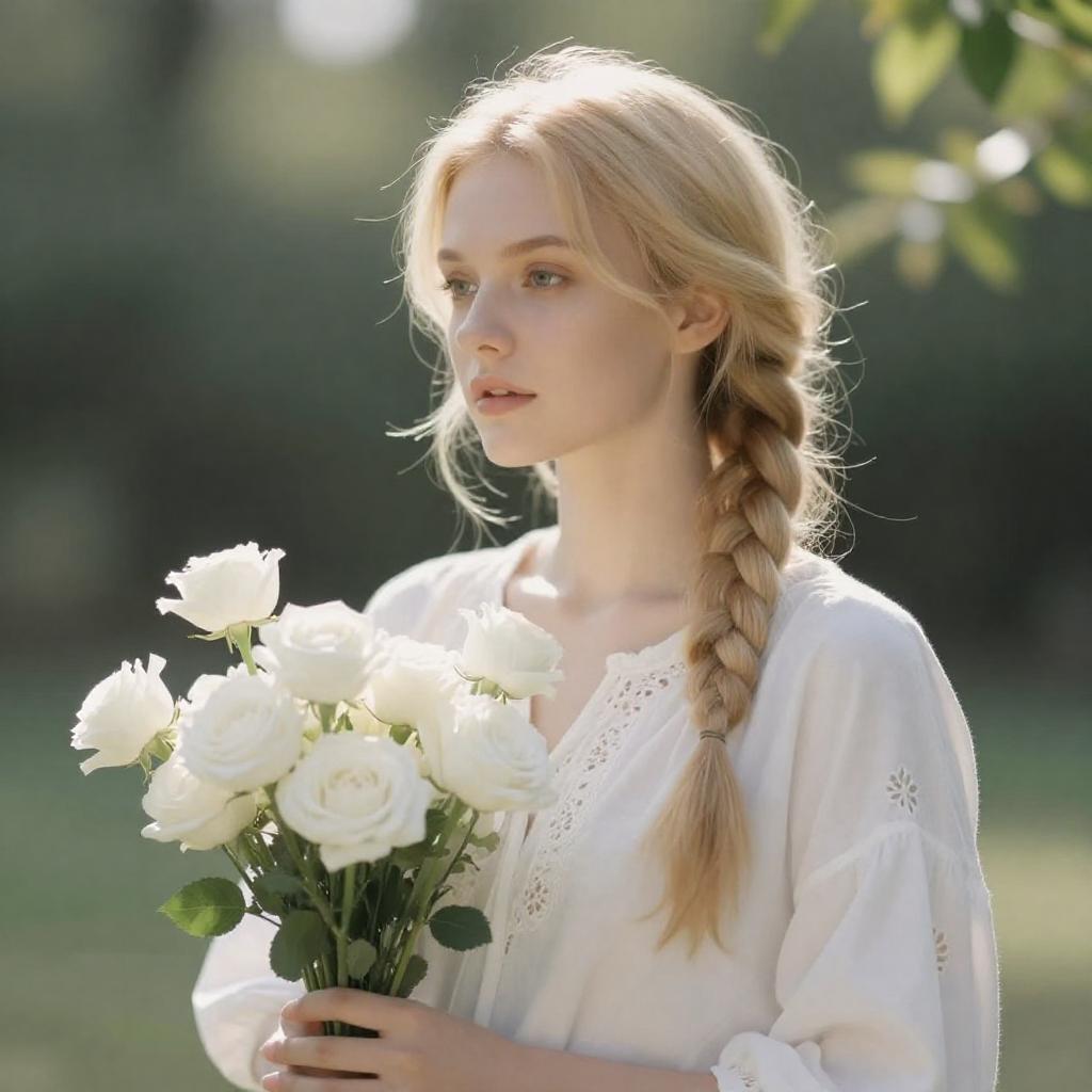 Photograph of a blonde woman with fair skin and braided hair, wearing a white embroidered blouse, holding a bouquet of white flowers. She stands in a softly lit, blurred garden background, looking slightly to the side with a serene expression. Sunlight filters through the foliage, creating a gentle, ethereal glow.