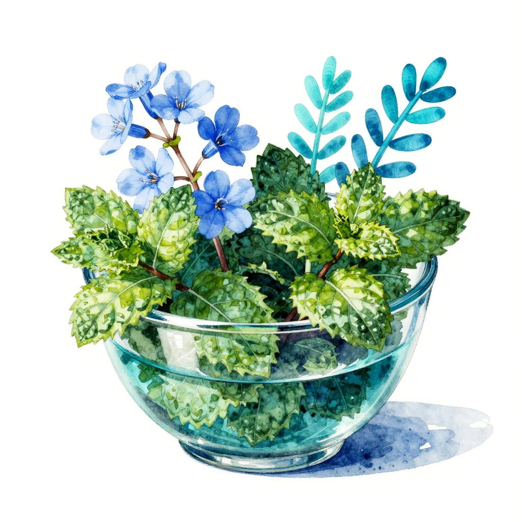 A contemporary still-life of a glossy teal layered glass bowl, filled with geometric mint leaves, blooming soft blue starflowers, and vibrant aquamarine sprigs. Executed in ink-and-watercolor with bold shapes, crisp edges, matte–gloss contrast, and careful negative space. Clean white gallery backdrop, vivid blues and greens, high contrast, subtle paper grain, refined lighting, serene mood, editorial quality.