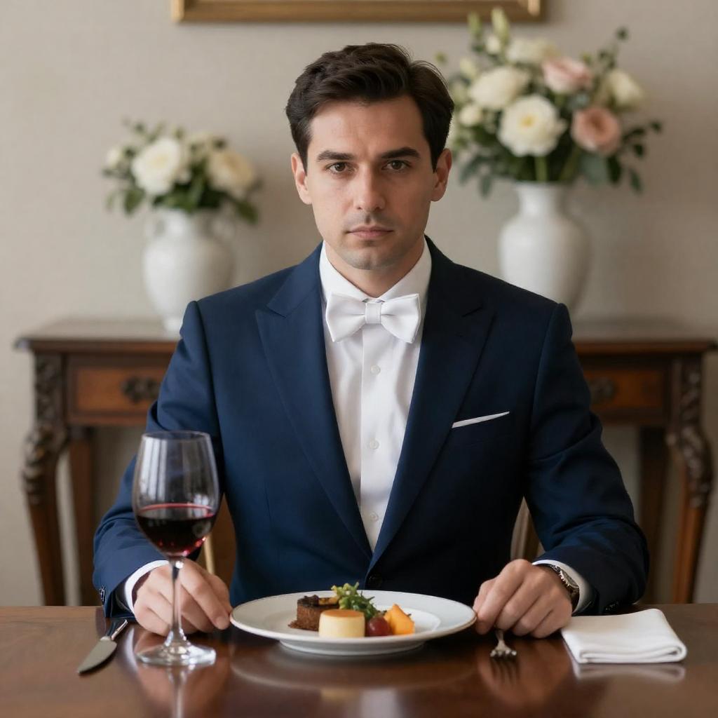 Photograph of a middle-aged man with curly dark hair, wearing a white, slightly unbuttoned dress shirt, seated at a red-clothed restaurant table. He has a serious expression, with his right hand resting on his chest. In front of him is a plate with a salad and a small bowl. The background is warmly lit with blurred restaurant decor.