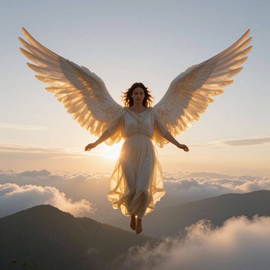 Real.angels soaring above a peaceful mountain landscape at dawn, golden sunlight filtering through their radiant wings, realistic human features blended with divine luminescence, detailed clouds and sky, a calm and majestic scene