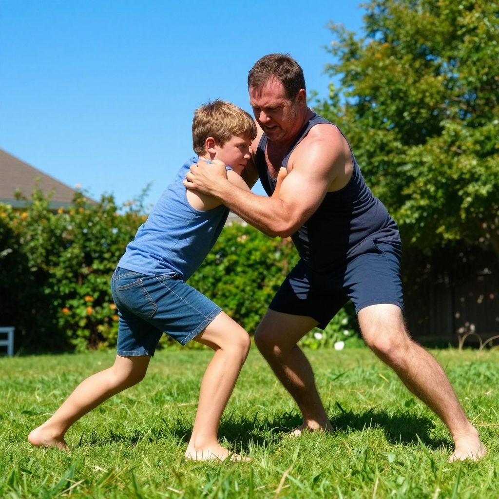 Father and son wrestling intensely in a sunny backyard, muscles flexed, expressions fierce yet playful, lush green grass and bright blue sky, dynamic action captured vividly.