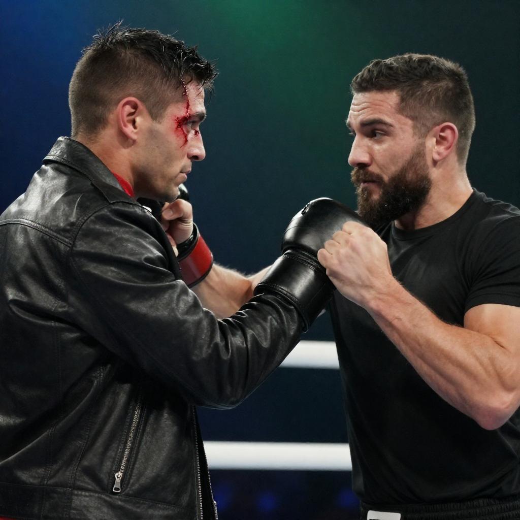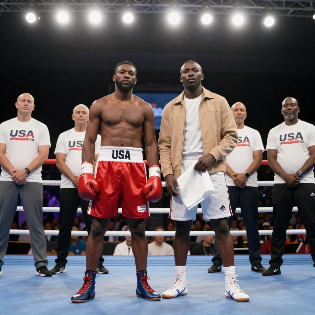 Photograph of a boxing match. A muscular, shirtless boxer in dark trunks and white robe being congratulated by an older man in a brown robe. Two other men in white robes stand nearby. Crowd in background. Right side has a portrait of a smiling woman. Bright yellow and blue border.