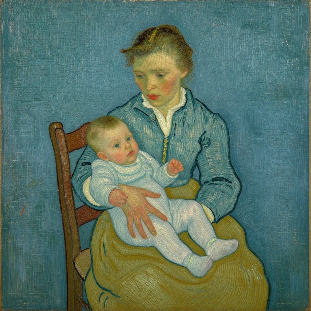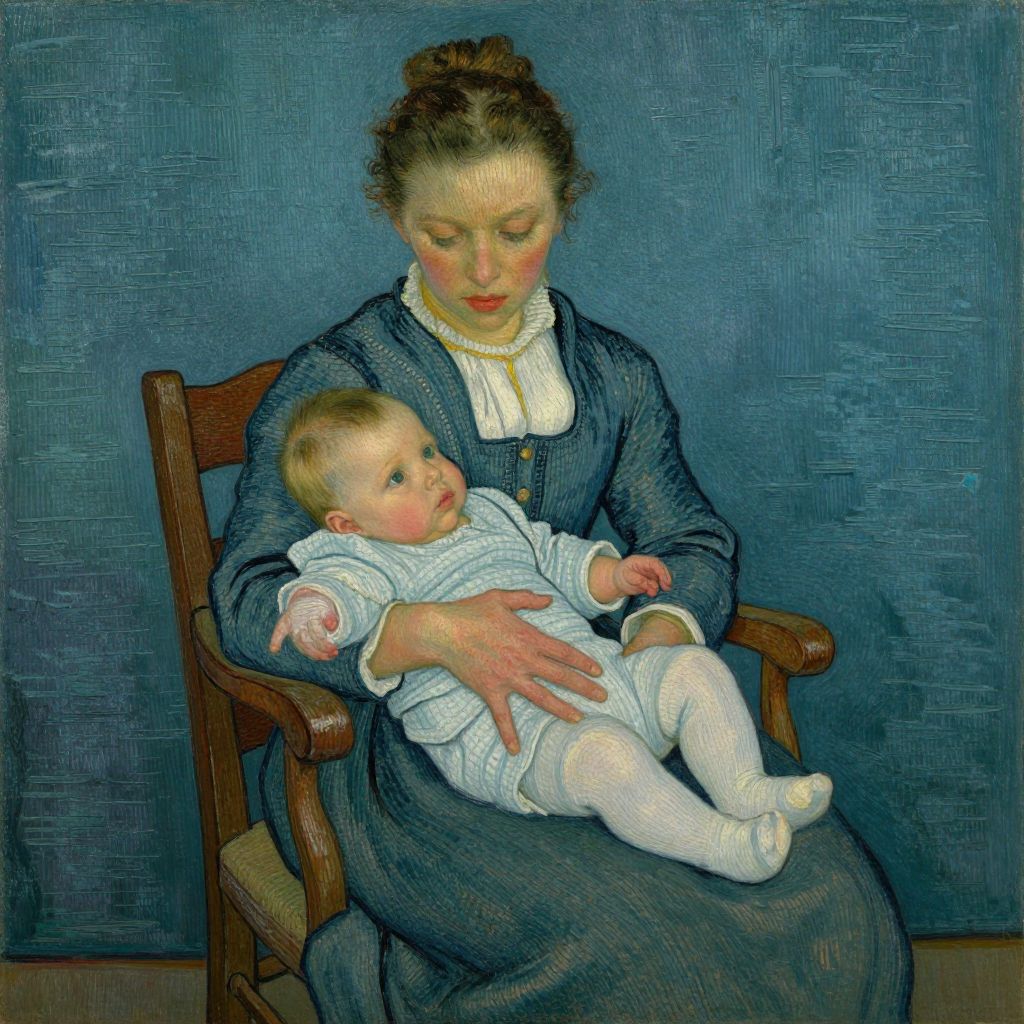 Woman seated in a wooden chair, tenderly cradling a baby in her arms, both dressed in period attire against a textured teal backdrop, evoking the style of Vincent Willem van Gogh's \"Portrait of Madame Augustine Roulin and Baby Marcelle,\" housed at the Philadelphia Museum of Art.