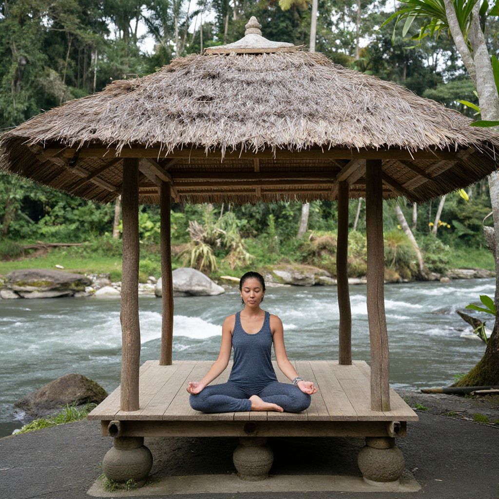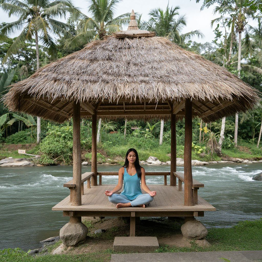 Photograph of a woman in a navy blue yoga outfit, sitting cross-legged under a thatched-roof wooden gazebo by a flowing river in a