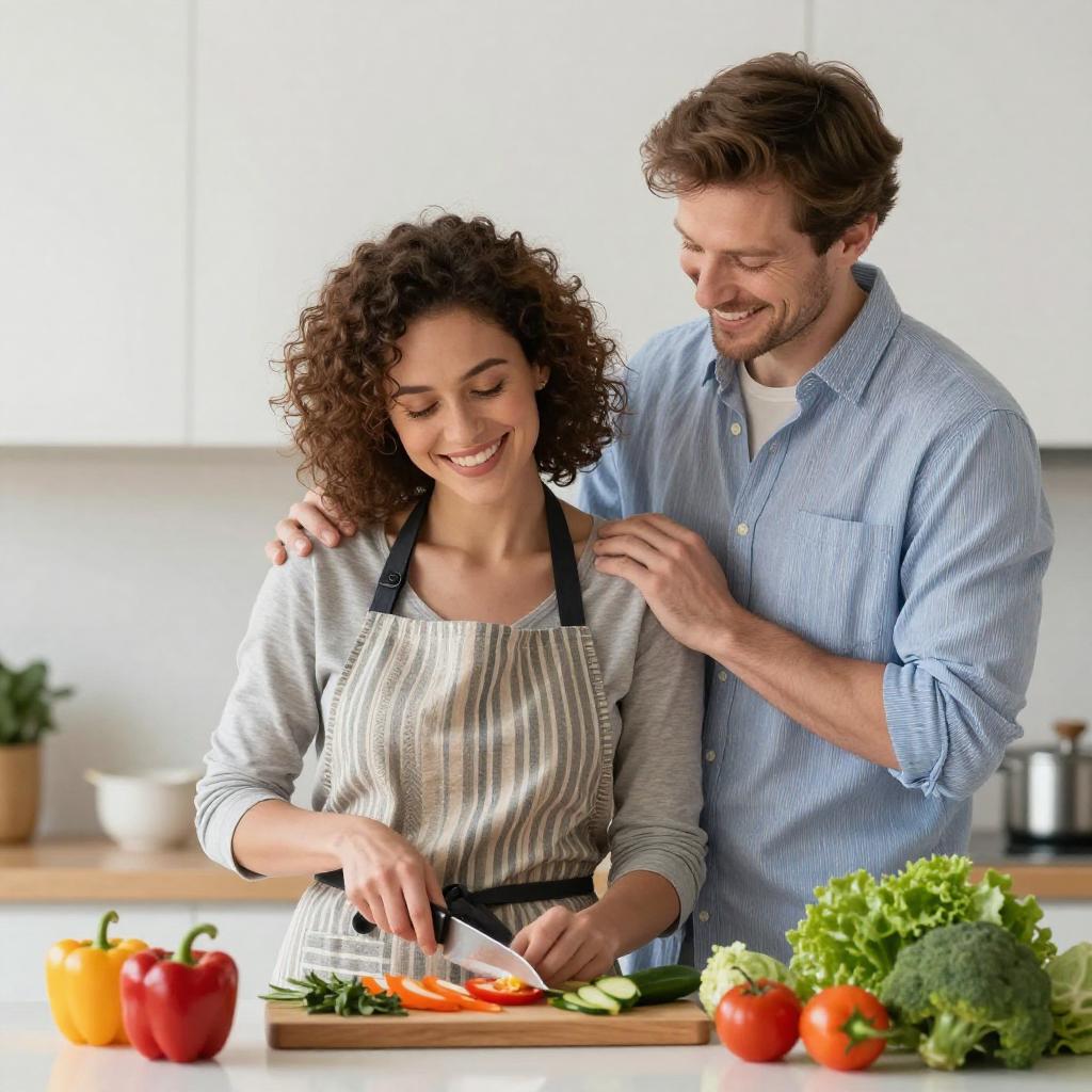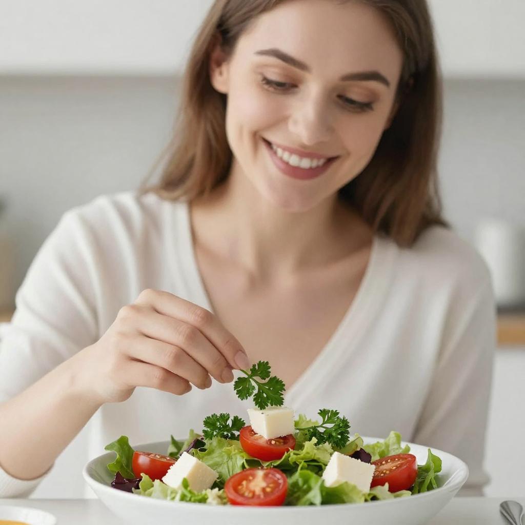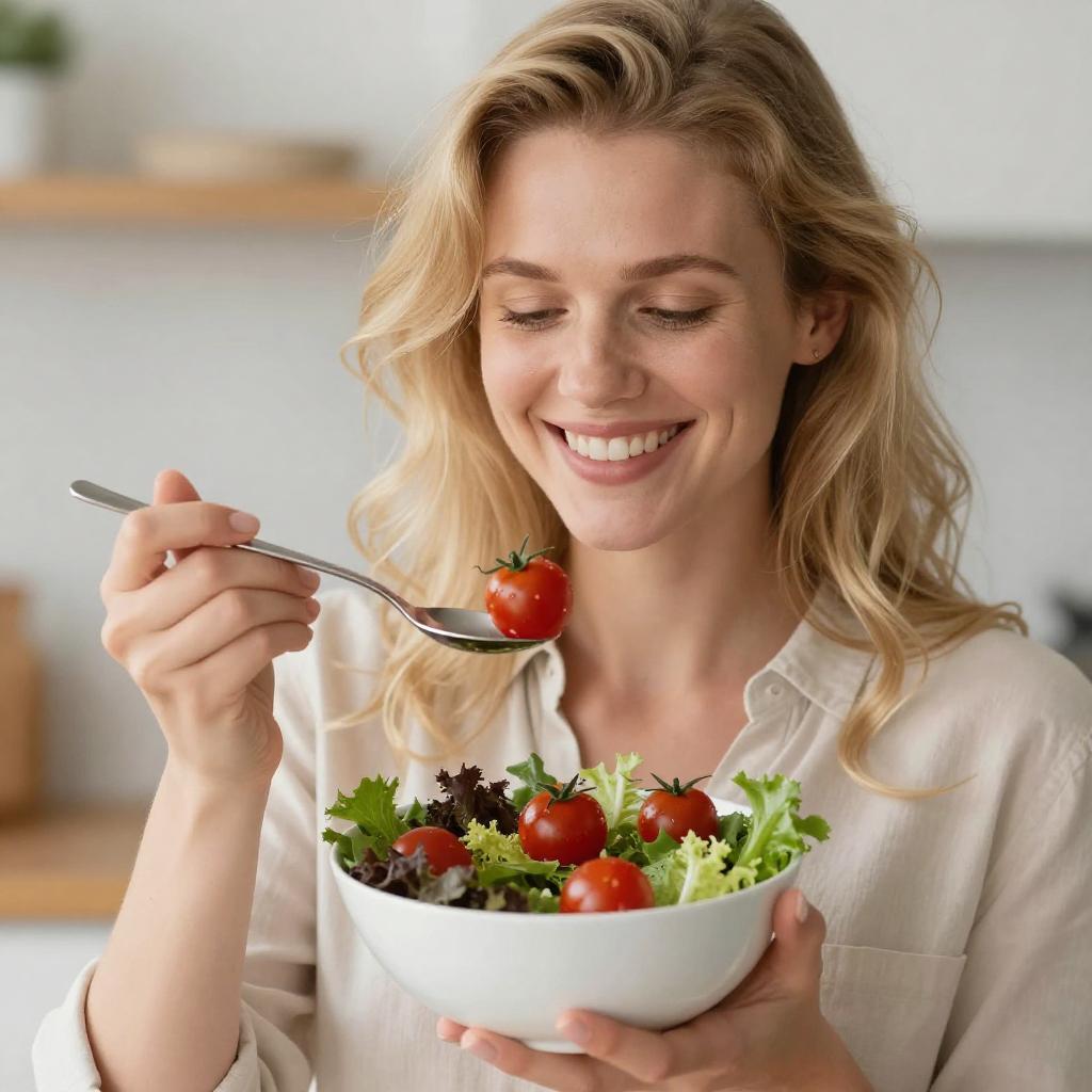 Photograph of a smiling woman with fair skin and dark hair in a ponytail, wearing a light green t-shirt and striped pajama pants. She's holding a white bowl filled with sliced tomatoes, cucumbers, and red bell peppers, using a spoon. The camera angle is slightly above eye level, with a shallow depth of field; the background is blurred. Lighting is bright and even.