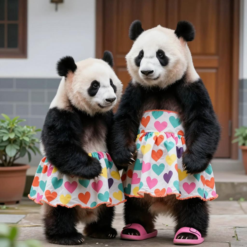 Two adorable pandas, an adult and a cub, stand outside a building wearing vibrant matching dresses decorated with colorful heart patterns. Both pandas have black and white fur and pose affectionately while wearing pink sandals. The scene includes potted plants and steps leading to a wooden door.