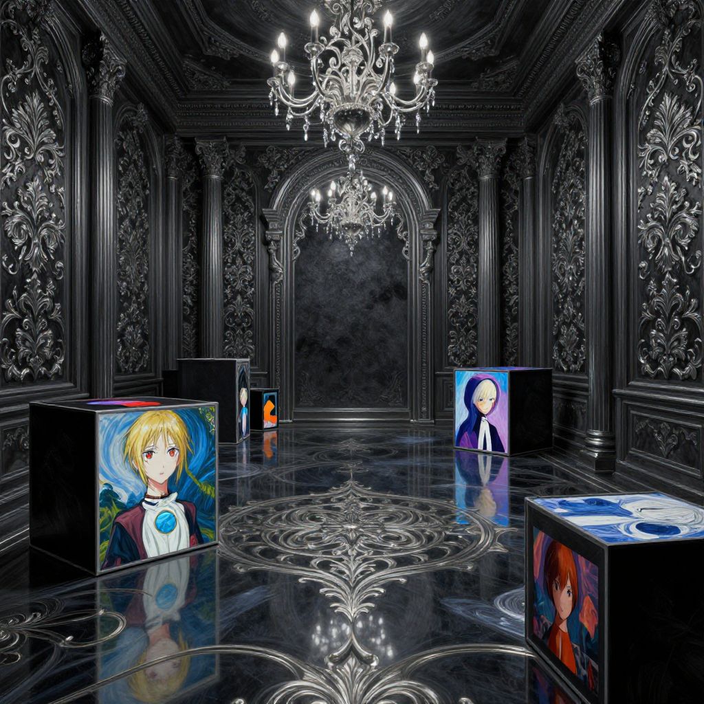 Digital anime-style artwork of a luxurious black and silver ornate room with a chandelier, featuring five colorful anime portraits on black cubes.