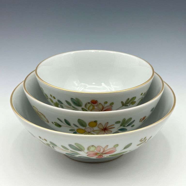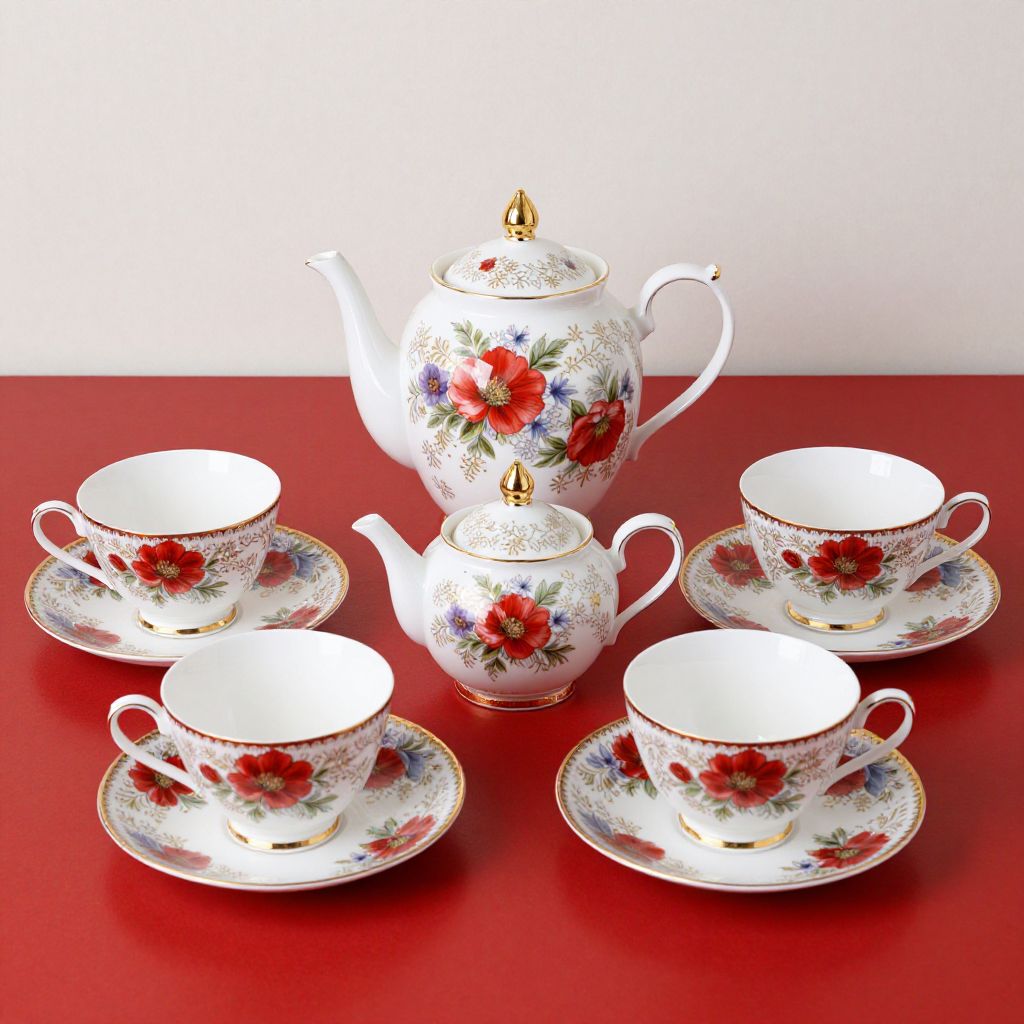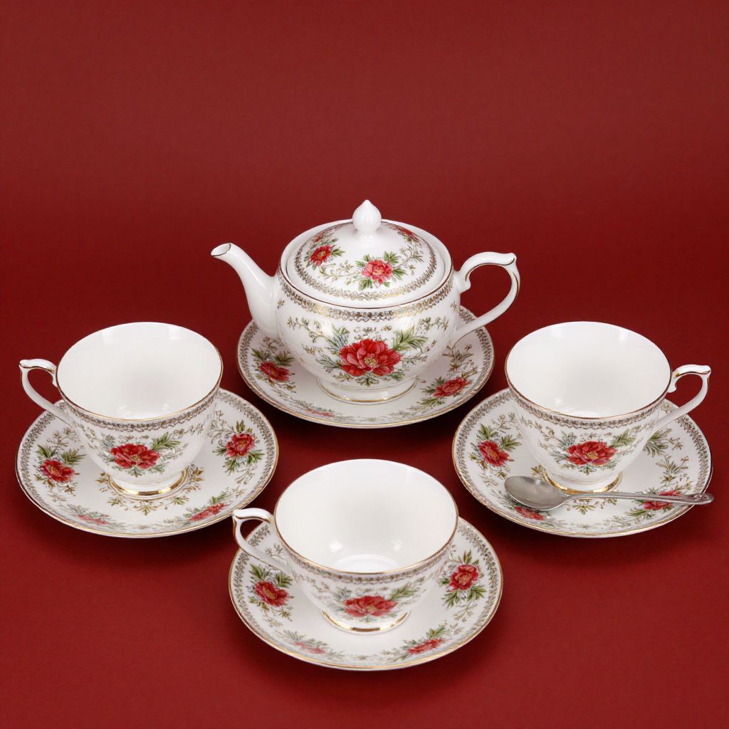 Photograph of an elegant, vintage tea set featuring a white porcelain teacup with gold trim, green floral patterns, and matching saucer and plate
