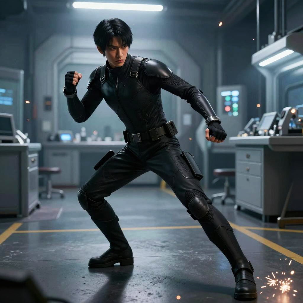 Photorealistic CGI image of a fit, Asian male in a black, form-fitting tactical suit with leather accents, standing in a dimly lit, futuristic lab. He has short, black hair and clenched fists, mid-action pose. The lab has grey desks, illuminated control panels, and a yellow line on the black floor. Bright lights overhead and small sparks on the floor add dramatic effect. His suit includes a utility belt and fingerless gloves, emphasizing a combat-ready appearance. The background is slightly blurred, focusing attention on the character.