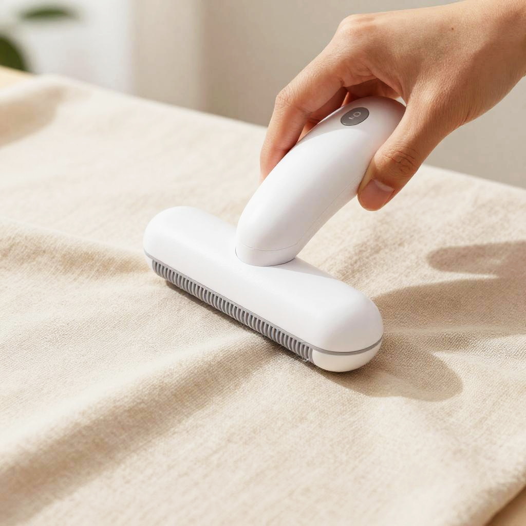 Free cloth remover tool being used on delicate fabric, soft lighting highlighting fabric texture, compact ergonomic device design, minimalist style, home environment with natural daylight, realistic rendering