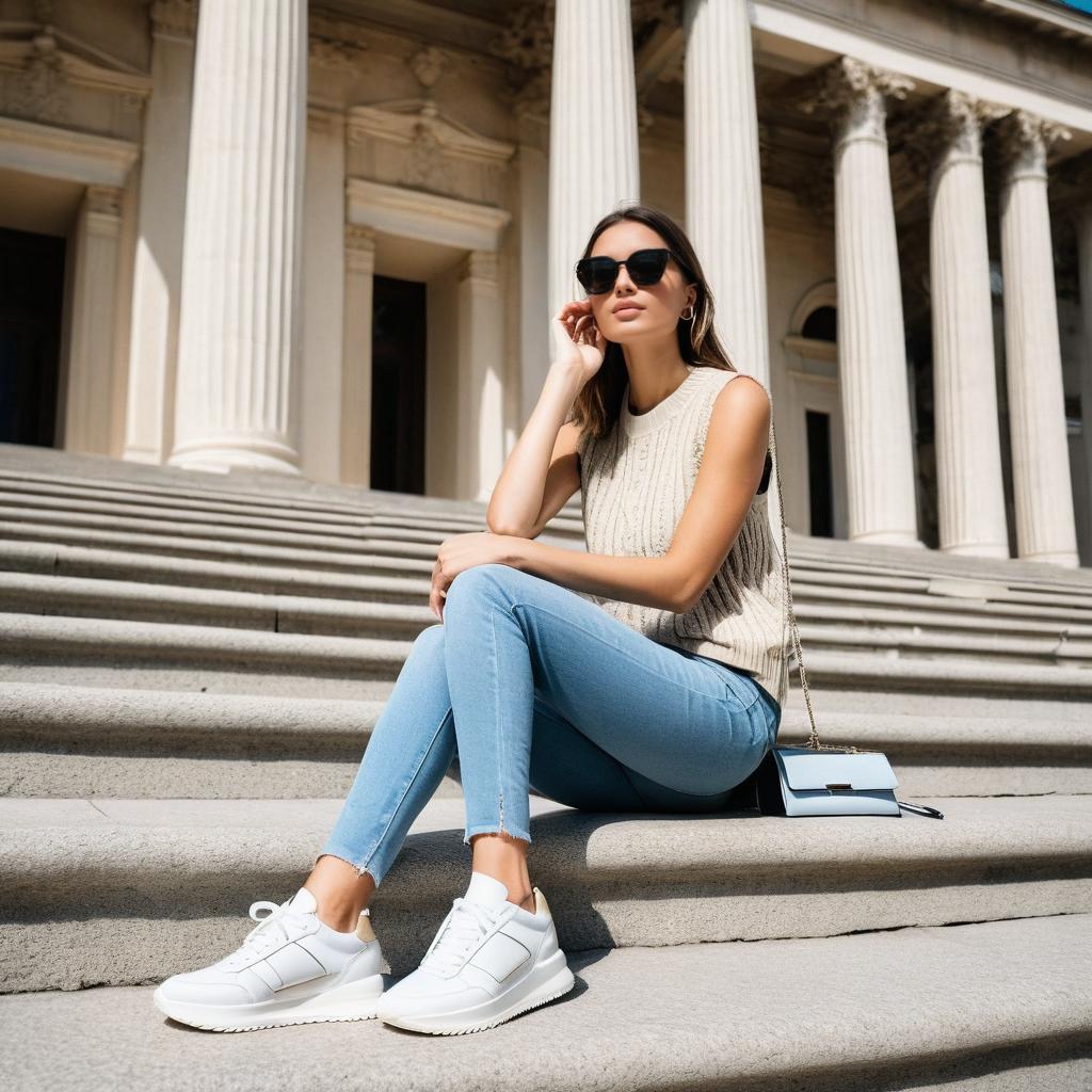 A young woman sitting on outdoor stone steps in front of a classical building with tall columns, wearing a beige knitted sleeveless top, light blue jeans, white sneakers, black handbag, sunglasses, natural sunlight casting soft shadows, urban casual fashion style, bright daylight with cool blue and beige colors