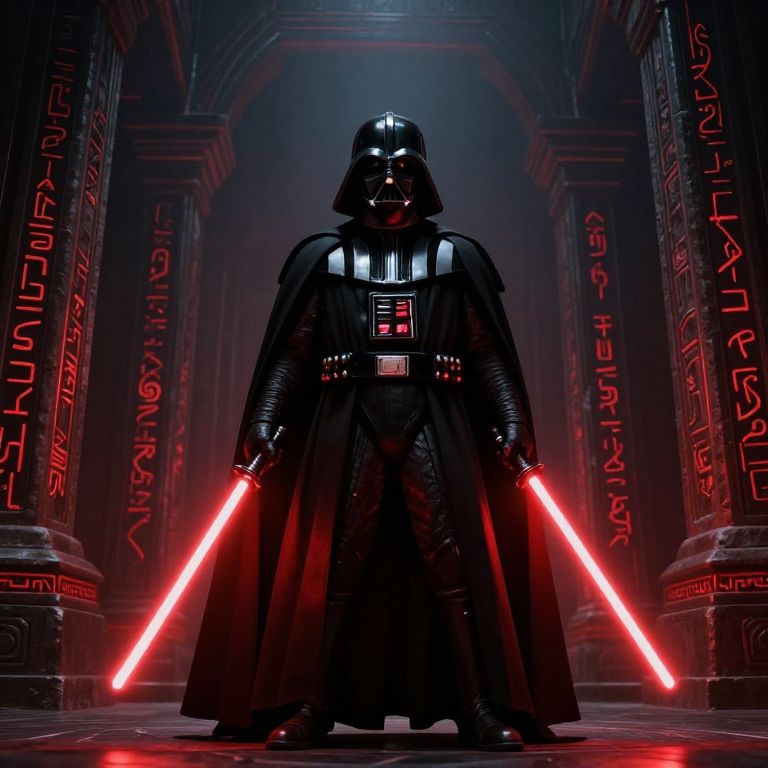 Photorealistic digital image of Darth Vader in a dark, neon-lit corridor, holding red lightsabers, with "Sith" inscriptions