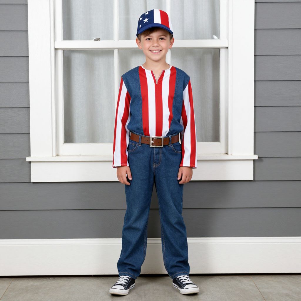 Photograph of a young boy standing in front of a gray wooden house with white-trimmed windows. He wears a blue baseball cap with white stars, a red and white vertical striped shirt, dark blue denim overalls with a brown belt, and black and white sneakers. He has short brown hair, a light skin tone, and a friendly smile. The background is plain, emphasizing the boy's patriotic outfit and the white window frame. The texture of the wooden house contrasts with his soft clothing.